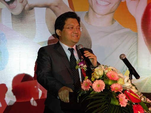 百強家具總經理陳曉太(左)與國富縱橫總裁趙龍(右)共同揭幕百強2010年新品