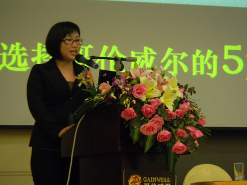 上圖:國富縱橫美盈項(xiàng)目負(fù)責(zé)人田女士作哥倫威爾品牌推介